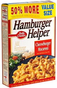Betty Crocker Hamburger Helper, Deluxe Cheeseburger Macaroni, 5.5 oz America's favorite Hamburger Helper is made with 100% REAL cheese for the real taste you love most. Our products are made with NO artificial flavors or colors from artificial sources. Directions You Will Need: 1 Lb Lean Ground Beef 1 1/4 Cups Hot Water 2 Cups Milk 2 Tbsp Butter