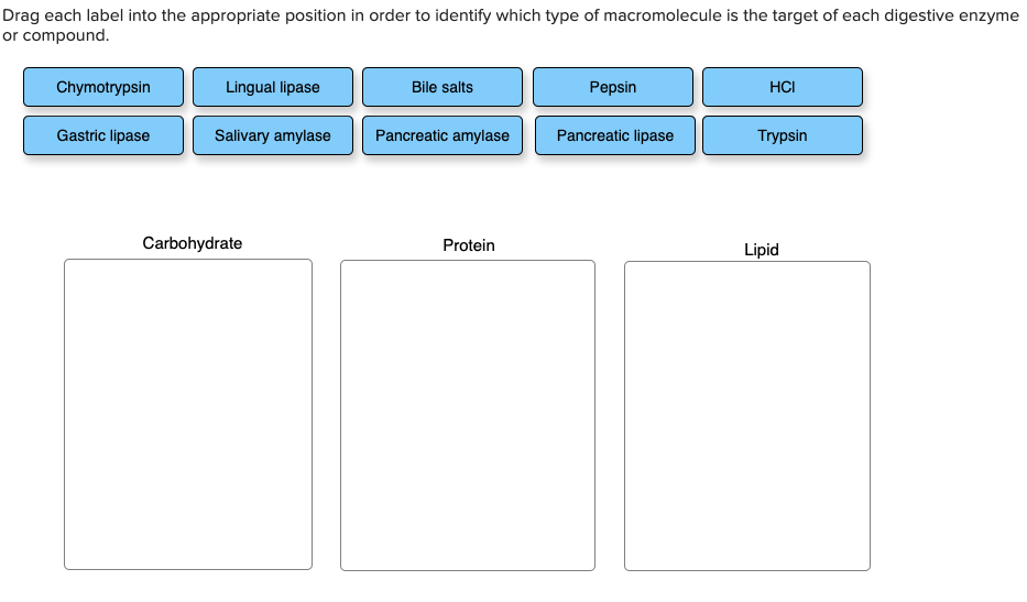 Solved > Drag each label into the appropriate position in ... - ScholarOn Drag each label into the appropriate position in order to identify which type of macromolecule is the target of each digestive enzyme or compound.... Drag each label into the appropriate position to identify what type of immunity is classified by each label.....this is the only one I have left...