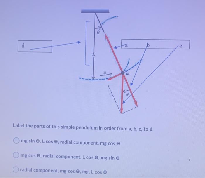 physics - Labelling diagram of oscillating pendulum - Mathematics Stack ... Consider the equations for Simple Harmonic Motion. (1) s = A cos ( ω t) Differentiating with respect to t : (2) v = − A ω sin ( ω t) Differentiating again with respect to t . (3) a = − A ω 2 cos ( ω t) Note that if the displacement is maximum (Position A or C ), the value of s = A. Hence, at that point cos ( ω t) = 1.