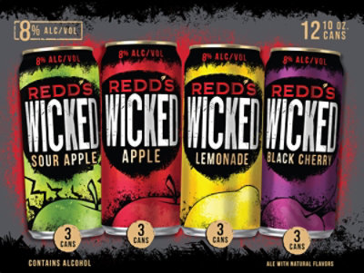 Redd's Wicked Apple Ale Price & Reviews | Drizly There's Wicked Within. Born from the seed of Redd's, Wicked is the refreshingly hard ale that is brewed with bold fruit flavor. At 8% ABV, Wicked turns up the dial on real fruit flavor for an intensity that starts strong and finishes smooth for ultimate refreshment. Available in Apple, Black Cherry, Lemonade, Watermelon, and Limited Release flavors. Also, a Variety 12-Pack with 4 flavors ...