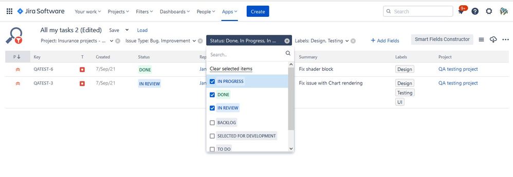 Filter issues on your Advanced Roadmaps timeline | Jira Software Cloud ... Issue types — Only show issues of a certain type. What's available depends on the Jira issue types mapped to Advanced Roadmaps. Components — Filter by components, assuming they're configured in your plan. Labels — Filter by labels, assuming they're configured in your plan. Dependencies — Show only issues with dependencies in your plan. Page Properties Report Macro | Confluence Data Center and ... Aug 04, 2022 · Put simply, OR values are entered in the same filter, AND values are entered in different filter. Only some filters support AND. If the filter doesn't support the AND operator, you won't be able to add that filter more than once. For a NOT search, enter a minus sign (-) before the label. This'll exclude everything with that label.