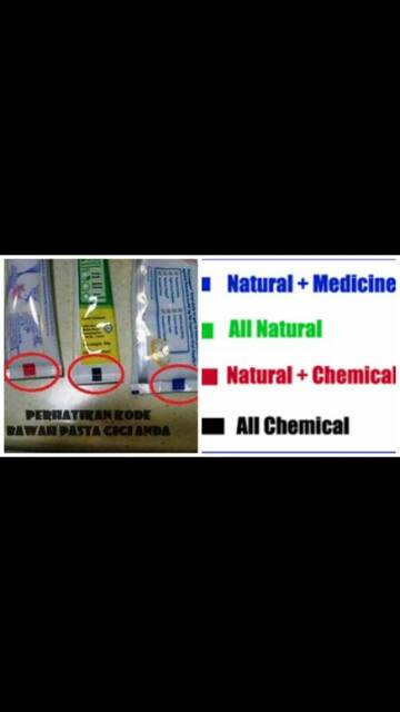 What is a Toothpaste Color Code? | Colgate® According to the posts, green marks mean the toothpaste is made from only natural ingredients, blue marks mean it contains a mix of natural ingredients and medication, red marks means it contains both natural ingredients and chemical ingredients, and black marks means it contains only chemical ingredients.