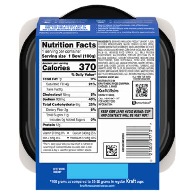 Kraft Macaroni & Cheese Kraft Macaroni & Cheese. Something everyone will smile about. From on-the-go microwavable snacks, to our signature blue box dinners, there's a Kraft Macaroni & Cheese to comfort you at any time of day. Blue Box products. Learn more. Microwavable products. Spirals 5.5 oz - Kraft Macaroni & Cheese Everyone will be all smiles at the dinner table with Kraft Mac and Cheese Spirals. Locate near me. Buy Now. nutritionfactpanel. Ingredients:. Made with 2% Milk Cheese 14 oz | Kraft Macaroni & Cheese enriched macaroni product (wheat flour, niacin, ferrous sulfate [iron], thiamin mononitrate [vitamin b1], riboflavin [vitamin b2], folic acid); cheese sauce (whey, part-skim milk, whey protein concentrate, dried corn syrup, sodium phosphate, milk protein concentrate, salt, contains less than 2% of milk, canola oil, tricalcium phosphate, sodium …
